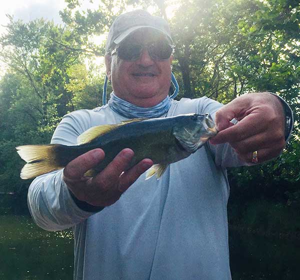 Bud and Mel are both students of mine that are continually improving. So, we pushed off on an instructional float on low, clear water that had the guys continuing to learn the tricks of smallmouth fishing visually. When they put the fly in the right place and moved it in a seductive way fish would appear out of nowhere and eat. Lots of fish came to the Wounded Minnow and topwater. We pulled out in the dark, as usual. ~jc