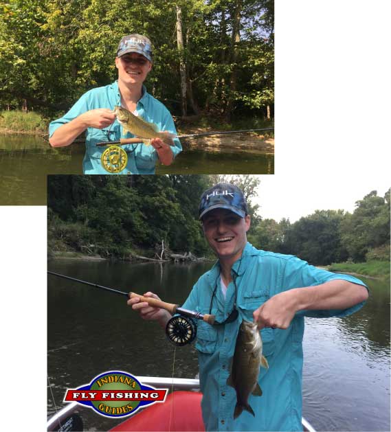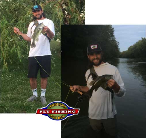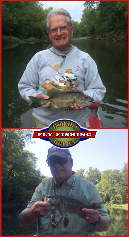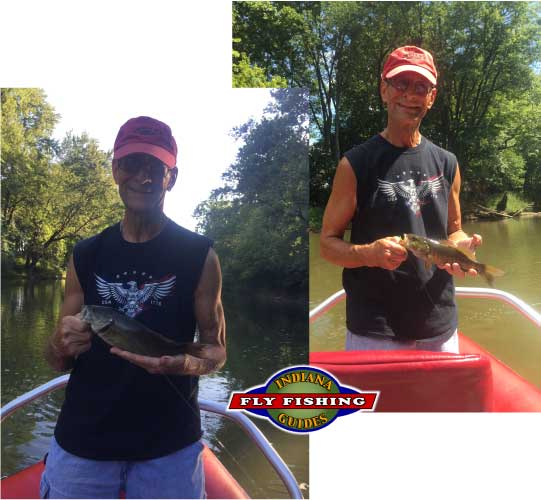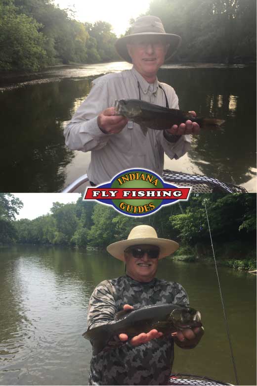 The Indianapolis Flycasters Club purchased a trip from me to raffle off at one of their meetings: The losers we Bill and Jacob, who were forced to fish with me. We took off at noon on a scorching hot, humid day. It was 96 degrees and hazy/sunny... the kind of day when you expect to see heat lightning. The water was low and very clear, and the sun kept the fish back in the shade. We prospected with various flies: topwater, wounded minnow, etc. and found a few fish in the upper river. As we moved into the lower river, we started finding fish in deeper holes. Bill hung a goodun (18") on a small blue popper. Fishing wasn't fast but active enough to keep our hopes up with each cast. As the sun dropped, fishing picked up to a respectable pace and the guys each got a few nice fish. Of course, we were all drenched with sweat after spending 9 hours out in that weather, and we went through 1.5 gallons of water. ~ jc