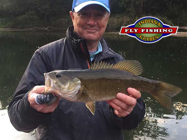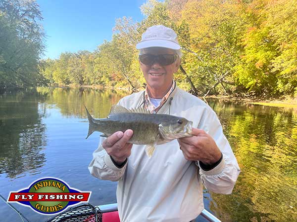 Nick Schroeder is the President of Central Indiana Trout Unlimited but he also likes to fish for Smallmouth Bass or anything else that will eat a fly. Nick won this trip in a silent auction at the Flyfishing Film Festival. We met just before noon and pushed off about 12:15 on a cool, windy, almost blustery day with cloudy skies and a 40% chance of rain. I offered Nick the opportunity to reschedule, but he wanted to forge ahead and fish. I never know what to expect when the first cold snap of the season hits us. The water temp had dropped 4-5 degrees overnight. A drop like that usually turns the fish off, at least early in the day, but in the Fall it can turn them on instead... and it did. It took awhile for the activity to turn on, but once it did we had steady fishing until near dark. We tried lots of tactics... small Murdich's, wiggle minnows, topwater, purple darters, etc. to no avail. But once we put the Dying Minnow on it was steady fishing with some larger fish smacking the fly, including one pig of a fish that broke off the fly on the take like a bum stealin' a pork chop. We even sight-fished some good-sized fish in a deep, clear pool and caught a few of them. Nick is a soft-spoken guy but his chuckles were heard clearly over the splashing of nice Smallmouth. ~jc