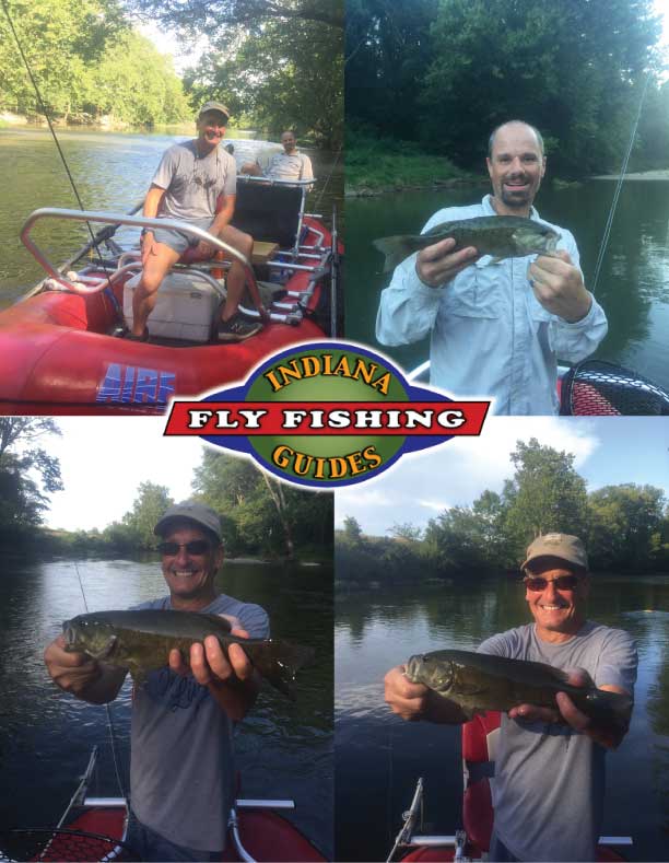 Wayne and Tracy are good friends and avid supporters of our wonderful flyfishing charties here in Indiana... Casting for Recovery and Project Healing Waters. They purchased a silent auction trip while attending one of our key fundraising events, the Flyfishing Film Tour in March of 2016. We futzed around with schedules but had trouble finding time, the water went bad, I had knee surgery, then the water went bad again, and again, and again! Finally we got the job done, and it was fun, and fish were caught. We took off about 12:30 and folowed my familiar path by hanging in the upper river until there was a pretty good chance of topwater action. The first fish was a 16"... a nice surprise that smacked a deerhair topwater within 50 feet of the boat ramp! Always a fun start, but frequently met with disappointment as that first "accidental fish" is not immediately indicative of the upcoming fishing early in the afternoon (the dog nap hours). The fish were slow to turn on, probably due to the lower night time temperatures followed by an absolutely bluebird day with a high of 80. It was clear to me that the suckers are moving into their Fall behavior, with large schools milling about and swimming upstream. And where suckers go, Smallmouth seem to be nearby. With every school of suckers, a few Smallmouth would be swimming with them. They are harder to spot, but their black-tipped tails give them away. Anyway, we found fish in wood rubble in the shade, and later in slower, deep water. Not many fish were eating in the faster water above or below riffles. The topwater flies that got the most action were the cup-faced poppers tied with the Double Barrel popper heads (small) in chartreuse and Conrad's Deerhair Diver (affectionately known as the "Snack") in bright yellow and dirty yellow. Wayne and Tracy both caught plenty of fish, Wayne caught one real big fish (video below), they missed a few good ones, and let me catch a couple of fish during lunch:-) Tracy, a southpaw caster, emailed this morning, "Ok, so I'm sore on my left side. Not just my palm or my hand or my arm, MY ENTIRE LEFT SIDE. It's a happy hurt though." 6 miles of streamer and popper fishing with a cast every 20-30 feet can really take it's toll. We are fully into the low/slow water of Summer, which really takes it's toll on my shoulders when it's time to row through the frog water to get to the next hole. If we don't get any rain, I'll be dragging the boat through shallow gravel within a week. With float trips scheduled for the next 3 days, my shoulders are wincing in anticipation! ~jc